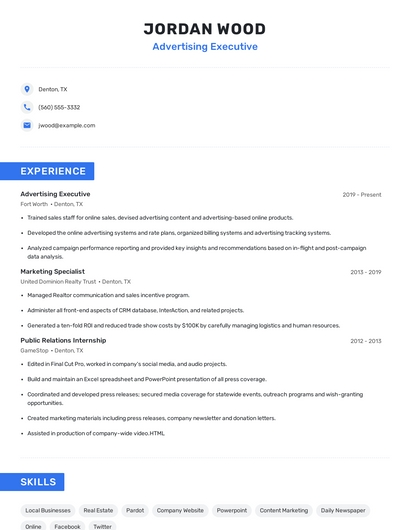 Build a professional advertising executive resume in minutes. Browse through our resume examples to identify the best way to word your resume. Then choose from 5+ resume templates to create your advertising executive resume.