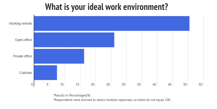 50% of workers say working remotely is their ideal work environment, more than any other option. The second most popular choice, open office was only chosen by 26% of workers as their preferred work environment.