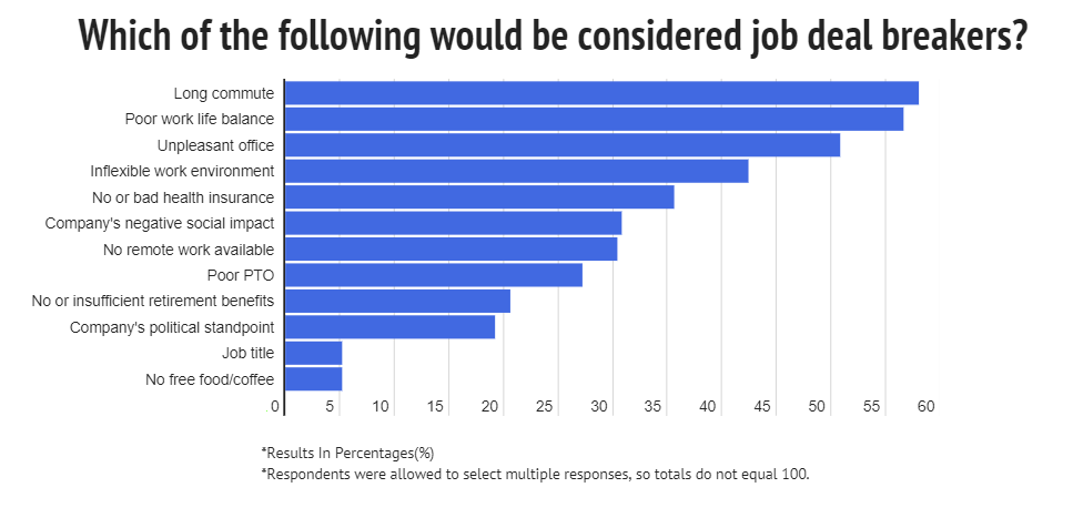 The number one factor workers cited as a deal breaker is a long commute. 58% of workers say a long commute is a strong no for them.