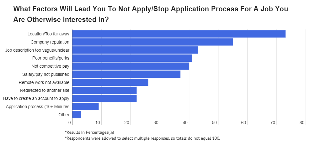 - The most common deterrent in applying to a job is location, with 73% saying it has stopped them from applying for a job.