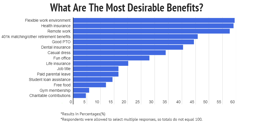 - Flexible work environments are followed by health insurance (edged out by only .4% at 59%), remote work(58%), and retirement benefits(46%) as the most desired benefits.