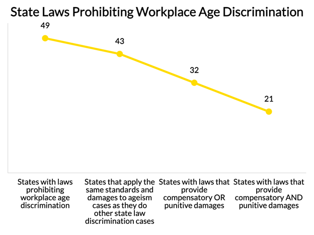 Forty-three states apply the same standards and damages to age discrimination cases as they do for other discrimination cases. Thirty-two states allow for compensatory and punitive damages, with 21 states permitting both.