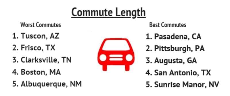 | Rank | City | Commute Time | Unemployment (%) | Hours Works | % Uninsured | Income To Housing Costs (Less Is Worse) |