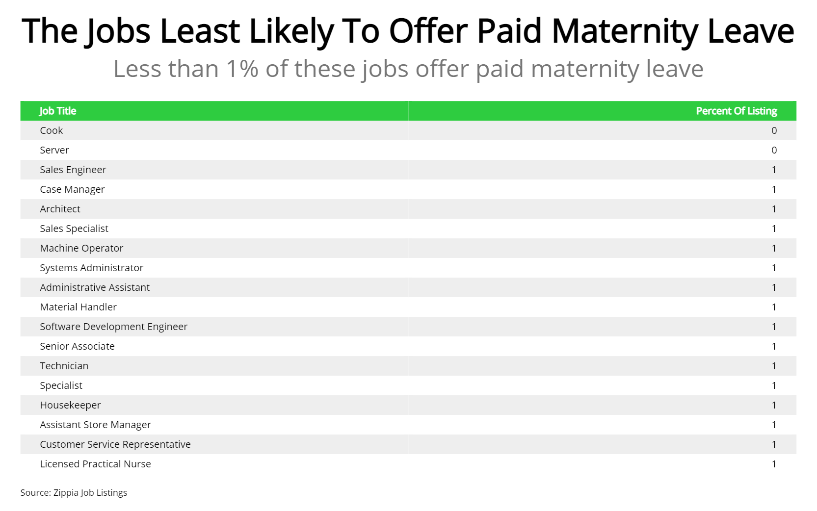 Notably, the roles of cook and server report 0% listings for paid maternity leave, reflecting the challenges faced by those in common, lower-paying positions.
