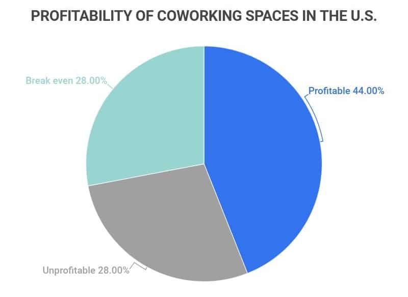 Just under half of all coworking spaces are profitable. 44% of working spaces in America are profitable, while 28% break even and another 28% lose money, as of 2019. However, a big reason why fewer than half of coworking spaces are profitable is because of the relative newness of coworking spaces altogether. A global survey found that 72% of coworking spaces become profitable after operating for two years.