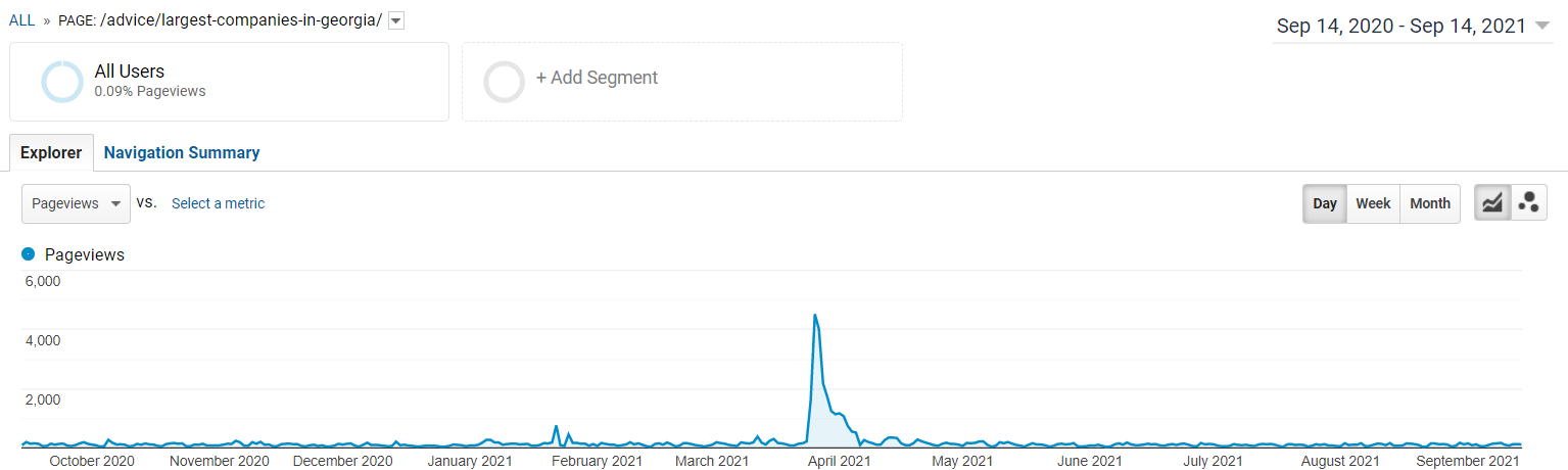 The bulk of traffic each article receives is organic traffic and relatively stable day-over-day. To determine the impact of state politics, we looked at a year of Google search traffic for each article. Then sought to identify the cause/explanation for the rare, dramatic spikes.