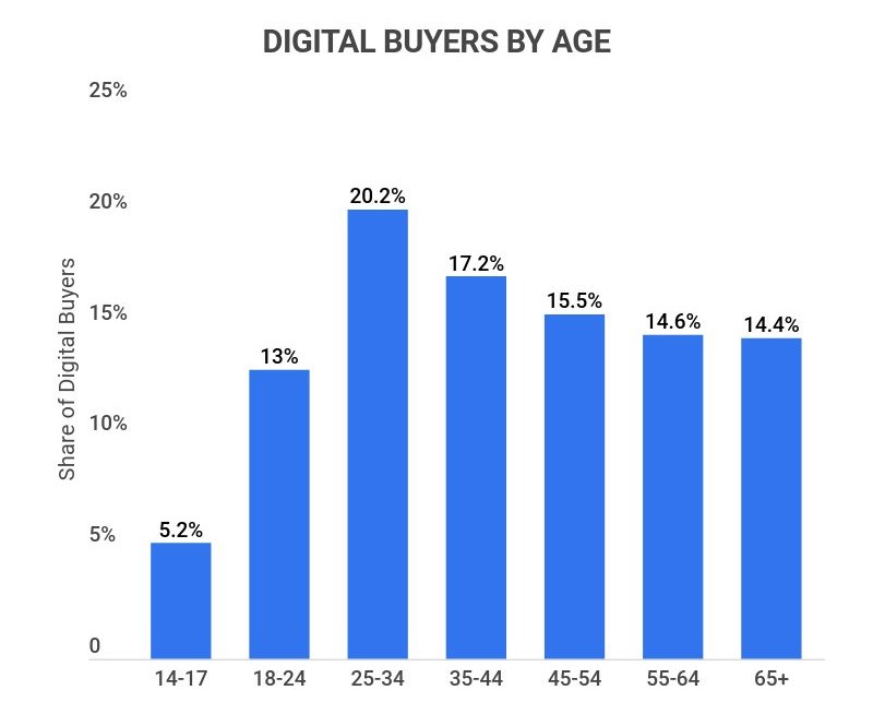 Following Millennials, individuals between ages 35 and 44 compose 17.2% of the nation’s online buyers, and people aged 45 to 54 make up 15.5%. Americans between ages 14 and 17 represent the smallest group of digital buyers at just 5.2%.