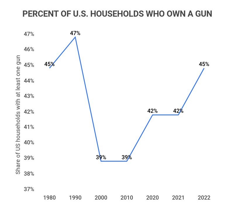 Roughly 45% of U.S. households have a gun. With that number divided between around 35% of those guns owned personally and 10% shared among the household.