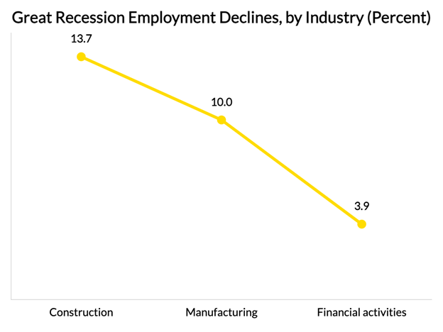 As is typical in recessions, goods-producing industries saw substantial employment declines. The Great Recession was no exception, with construction employment dropping by 13.7% and manufacturing by 10%.