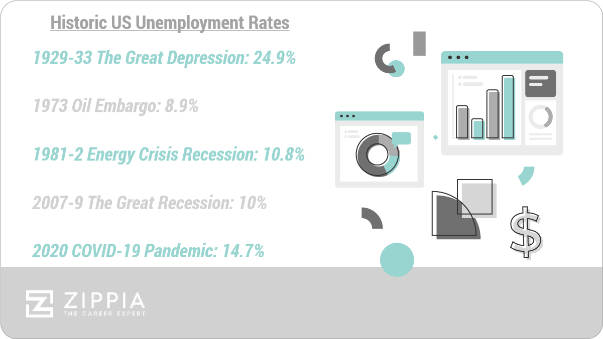 The U.S. experienced record periods of unemployment during the Great Depression (1929-1933), the Oil Embargo recession (1983-1975), the Energy Crisis recession (1981-1982), the Great Recession (2007-2009), and the COVID-19 pandemic (2020-2021).