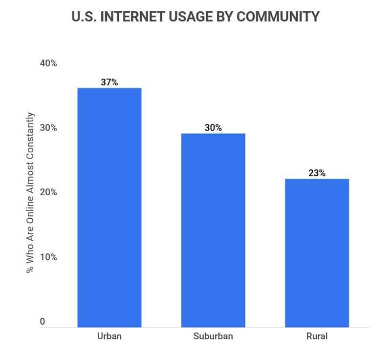 Americans living in urban areas are more likely to report heavy internet usage, with 37% saying they’re online almost constantly.