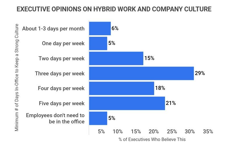 The majority (29%) of surveyed executives believe that employees need to spend three days per week in the office in order to maintain company culture.