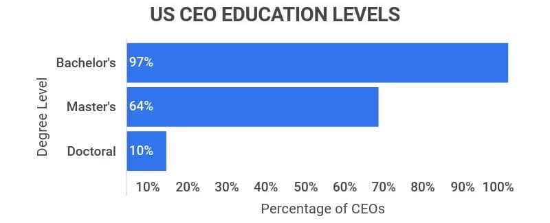 Chief Executive Officers are typically well-educated. Approximately 97% of CEOs hold a bachelor’s degree, 64% possess a master’s degree or equivalent, and 10% hold a doctorate.
