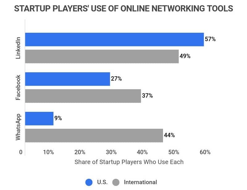 Networking plays a key role for entrepreneurs, and online networking is especially common. Of different websites, Linkedin and Facebook are most commonly used for networking, with Linkedin used by 56% and Facebook used by 37% of entrepreneurs.