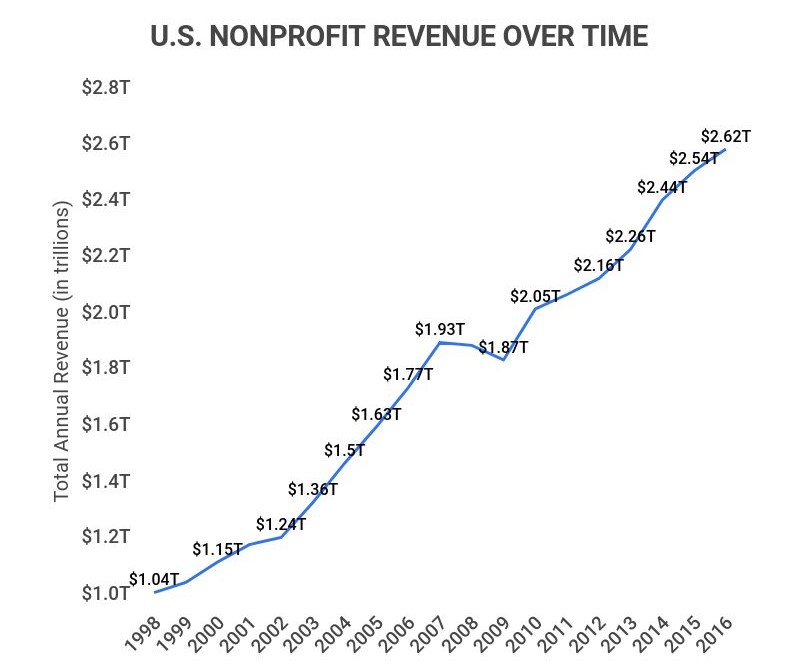 In 2000, the revenue for U.S. nonprofits stood at $1.15 trillion, which grew to $2.62 trillion by 2016.