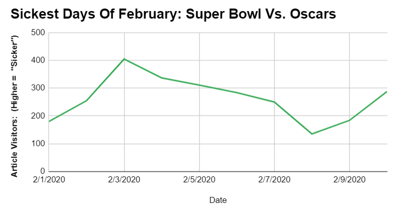 From examining our 2019 traffic data, we know that Mondays and days near holidays are the sickest days of the year. Since February is home to two late night Sunday events, the Super Bowl and the Oscars, we decided to hit the data and see which event had more people fake coughing.