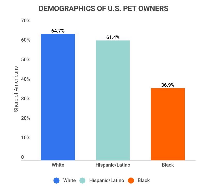 Not far behind, Latino/Hispanic households make up 61.4% of pet owners, and Black households have the lowest rate of pet ownership at 36.9%.