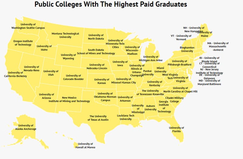 However, not all colleges are created equal. Yes, just like what you major in, where you go to school has major implications for your future earning potential. Some colleges set up students for success, while others leave them bogged down with student loans and scrambling for a job. We dove into the data to find the public college in each state with the highest earning graduates.
