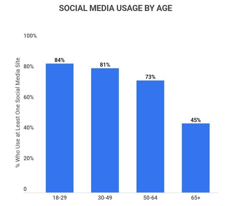 For instance, in the US alone 84% of those between 18-29 use at least one social media site, compared to 73% of those 30-49 and 45% of those 65+.