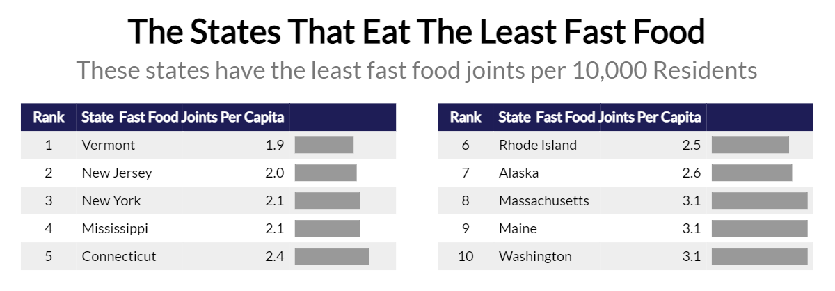 Vermont stands out with the fewest fast food restaurants per capita, possibly too satisfied with their local cuisine. The northeast generally has fewer fast food outlets compared to other regions, particularly the south.