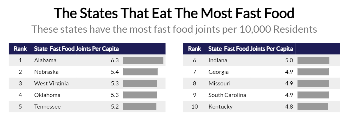 The state that loves fast food the most is Alabama, boasting 6.3 restaurants for every 10,000 residents.