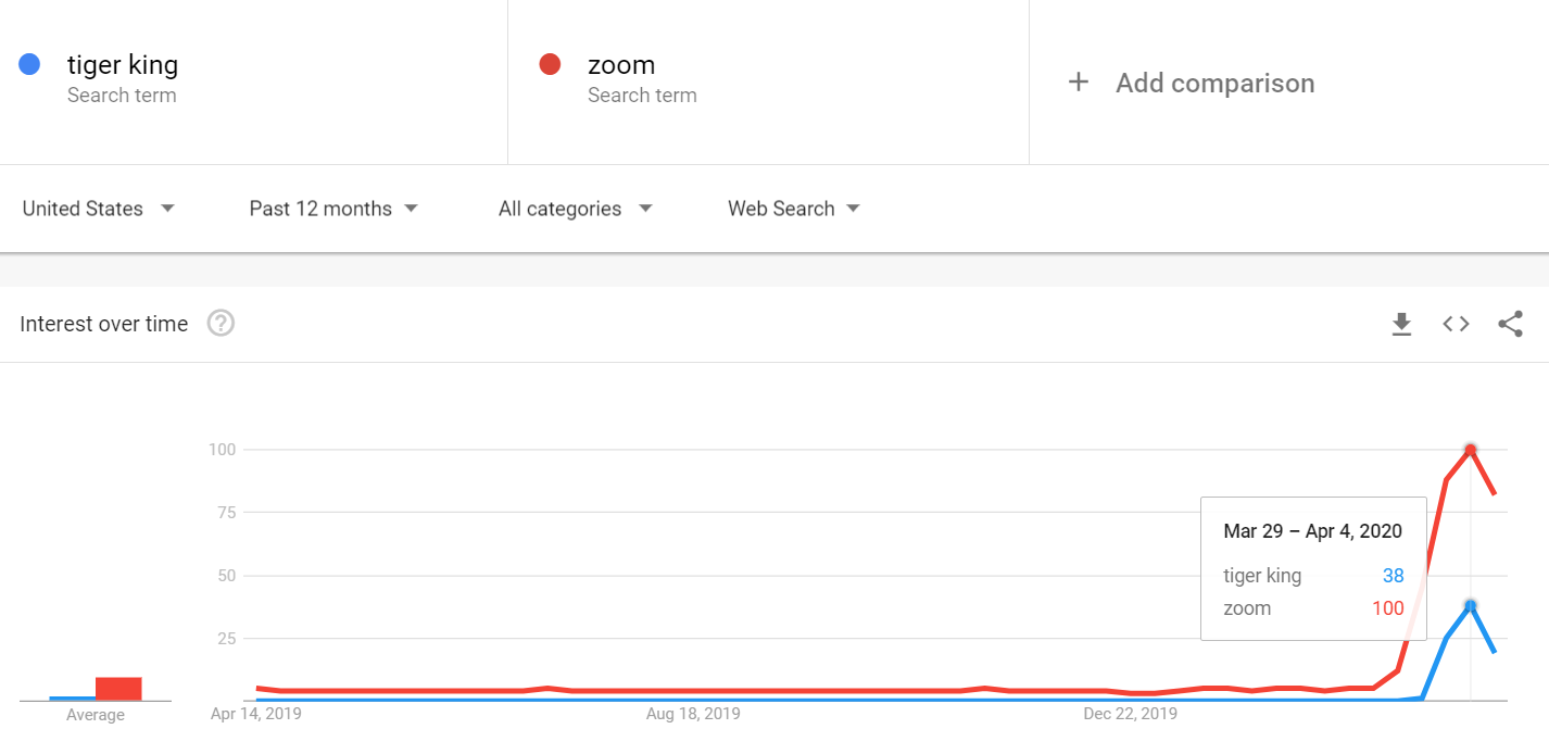 In our quest to see what people are searching for, we found this fun factoid, search interest in “Zoom” and “Tiger King” peaked at the same time period.