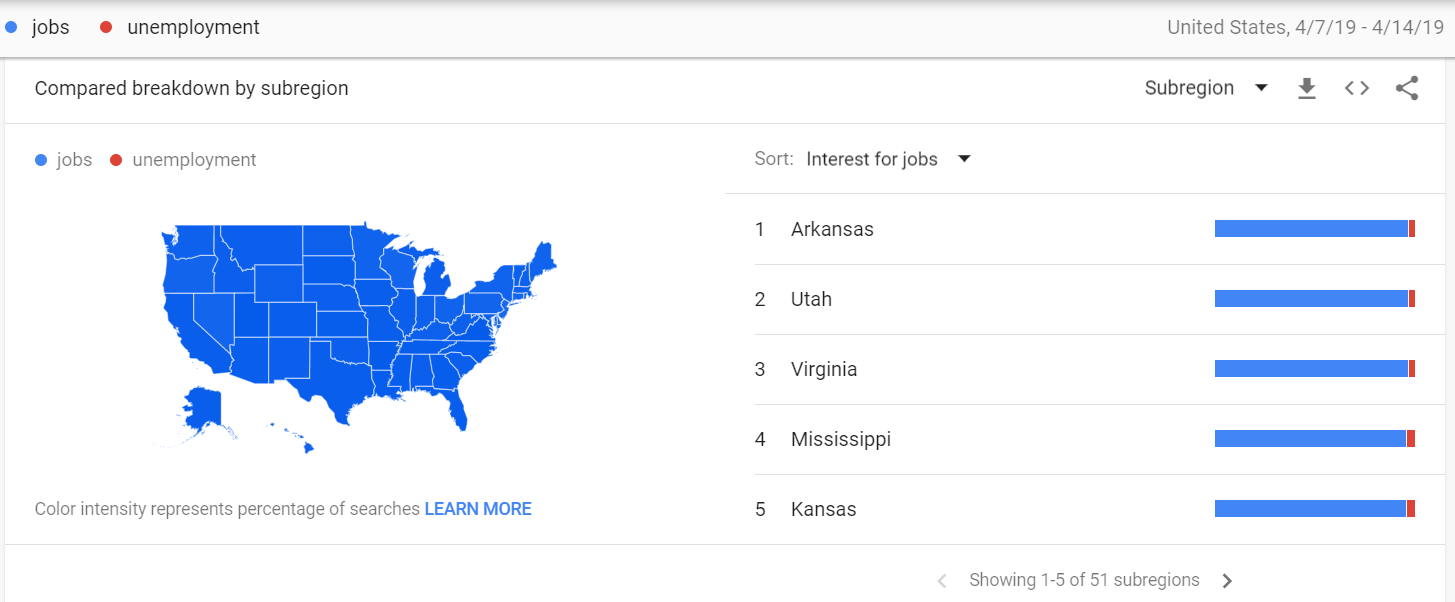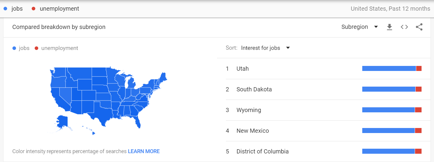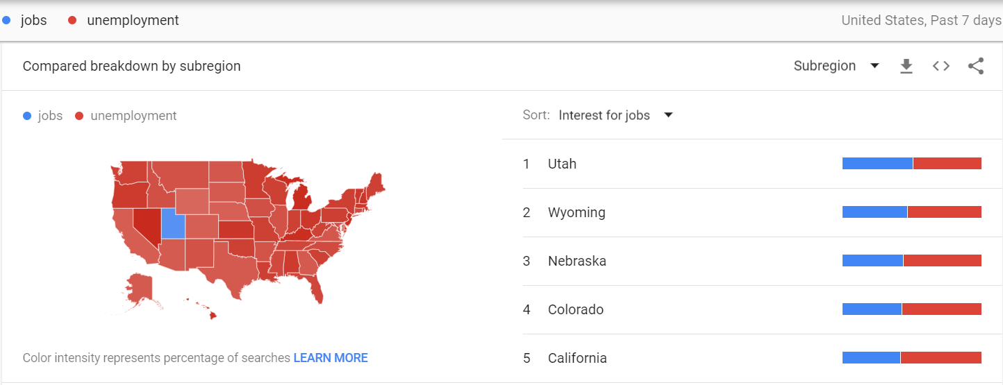 As you can see from the tide of red, in every state but Utah “unemployment” searches have been higher than “job” searches for the past 7 days. Even Utah hovers at 49%, 51%, a significant increase.