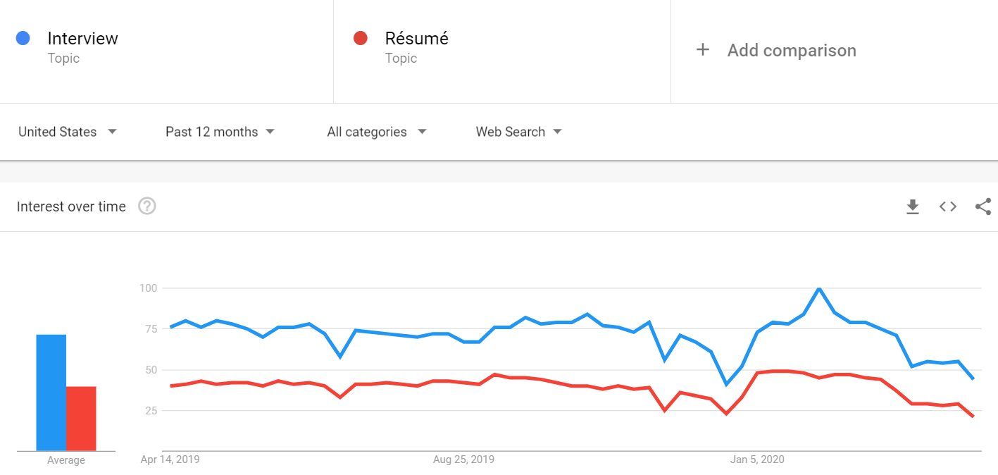 The decline in job search interest may be people who are still gainfully employed, but are reluctant to move jobs in the middle of a pandemic. Similarly, with many companies entering hiring freezes, skilled candidates may be receiving less tempting offers from other companies. The decreased searches for resumes and interview tips show the job market is in a weird limbo.