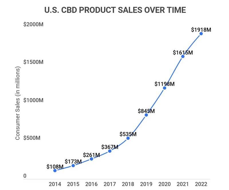 Between 2017 and 2022, CBD supplement sales surged by 422% (from $367 million to $1.92 billion).