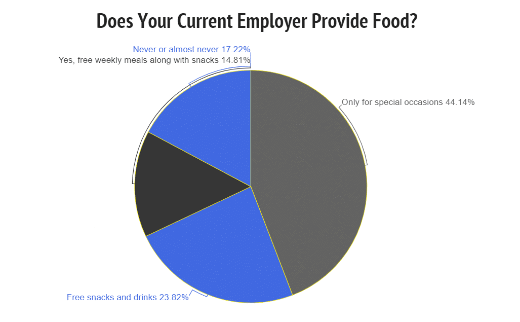 44% of workplaces provide food only during special occasions, such as holiday parties. Meanwhile, 17% of workplaces report that they never or “almost never” offer food.