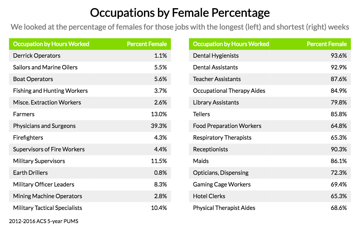 - Females are sparse to find in the longest hours category, but compose the majority of each position within the shortest work week list
