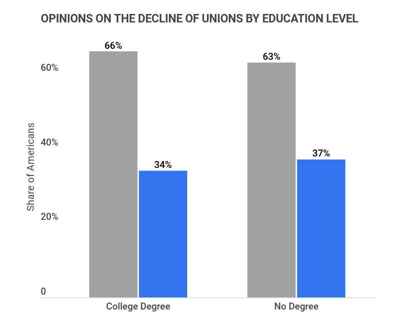 66% of Americans with college degrees agree that the decline in unions has been a net bad, while only 63% without degrees say the same.