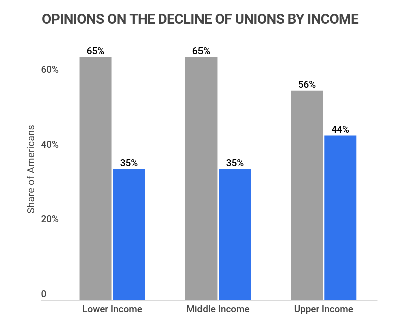 65% of people with lower and middle incomes agree that the decline in unions has been a net bad, while only 56% of upper-income people say the same.