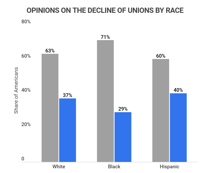 Black Americans see the decline in unions in the most negative light, with 71% agreeing it’s been a net bad for the country.