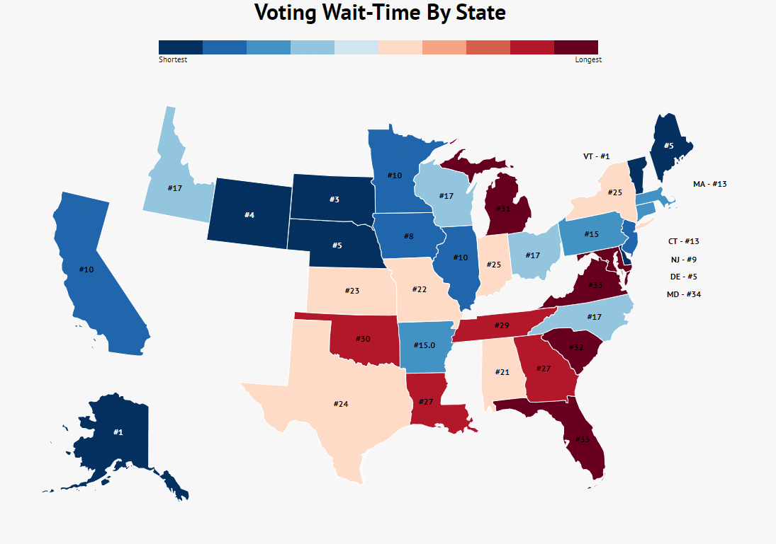 The map above indicates whether your state has higher or lower than average wait times. These times only include the amount of time spent waiting to receive your ballot. They do not include voting time, or the amount of time spent traveling to (or from) the polls.
