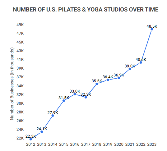 The number of yoga and pilates studios in the U.S. rose from 32,354 in 2017 to 48,547 in 2023.