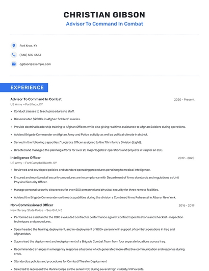 Build a professional advisor to command in combat resume in minutes. Browse through our resume examples to identify the best way to word your resume. Then choose from 5+ resume templates to create your advisor to command in combat resume.