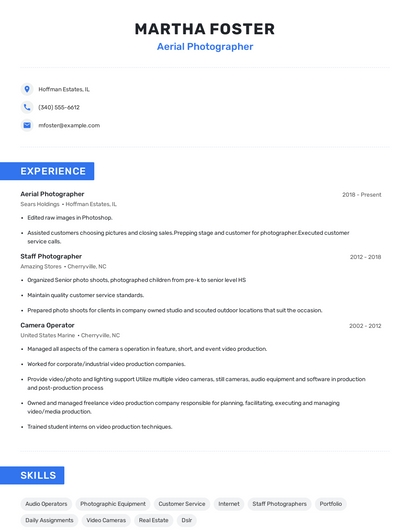 The most important skills for an aerial photographer resume and required skills for an aerial photographer to have include: