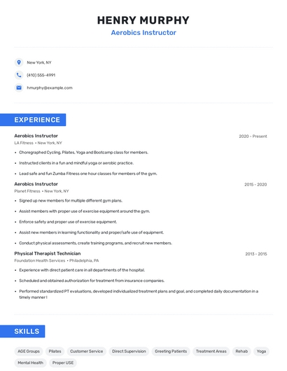 Build a professional aerobics instructor resume in minutes. Browse through our resume examples to identify the best way to word your resume. Then choose from 5+ resume templates to create your aerobics instructor resume.