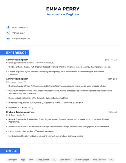 Build a professional aeronautical engineer resume in minutes. Our AI resume writing assistant will guide you through every step of the process, and you can choose from 10+ resume templates to create your aeronautical engineer resume.7. CFD
