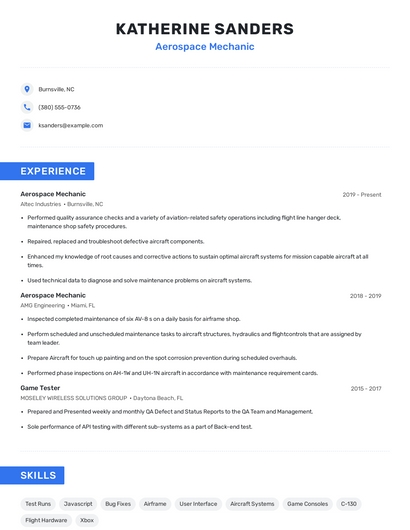 Build a professional aerospace mechanic resume in minutes. Browse through our resume examples to identify the best way to word your resume. Then choose from 5+ resume templates to create your aerospace mechanic resume.