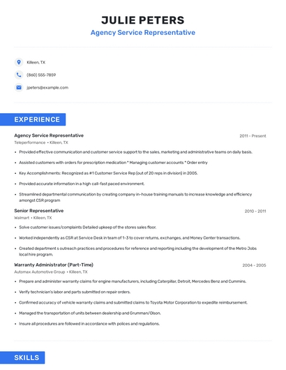 Build a professional agency service representative resume in minutes. Browse through our resume examples to identify the best way to word your resume. Then choose from 5+ resume templates to create your agency service representative resume.