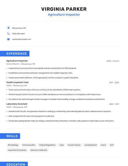 Build a professional agriculture inspector resume in minutes. Browse through our resume examples to identify the best way to word your resume. Then choose from 5+ resume templates to create your agriculture inspector resume.