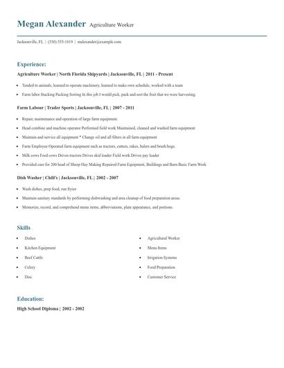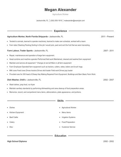 Choose from a variety of easy-to-use agriculture worker resume templates and get expert advice from Zippia’s AI resume writer along the way. Using pre-approved templates, you can rest assured that the structure and format of your agriculture worker resume is top notch. Choose a template with the colors, fonts & text sizes that are appropriate for your industry.