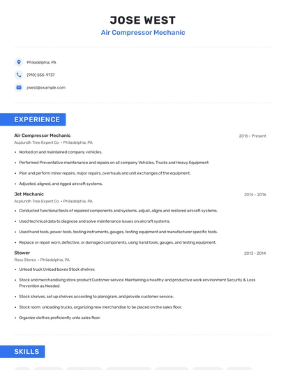Build a professional air compressor mechanic resume in minutes. Our AI resume writing assistant will guide you through every step of the process, and you can choose from 10+ resume templates to create your air compressor mechanic resume.7. FAA