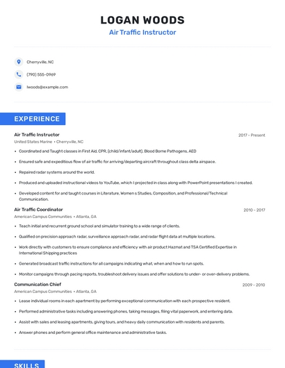 Build a professional air traffic instructor resume in minutes. Browse through our resume examples to identify the best way to word your resume. Then choose from 5+ resume templates to create your air traffic instructor resume.