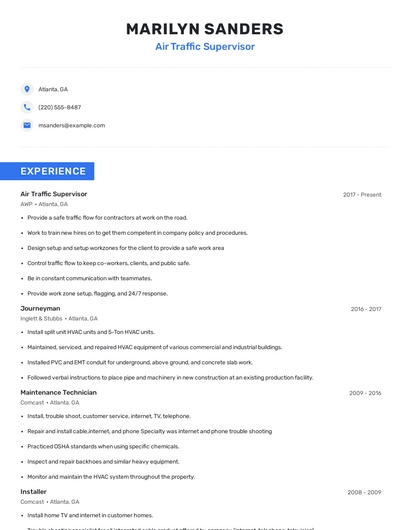 Build a professional air traffic supervisor resume in minutes. Browse through our resume examples to identify the best way to word your resume. Then choose from 5+ resume templates to create your air traffic supervisor resume.