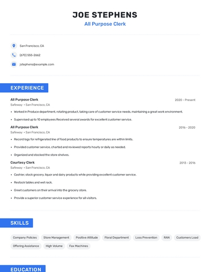 Build a professional all purpose clerk resume in minutes. Our AI resume writing assistant will guide you through every step of the process, and you can choose from 10+ resume templates to create your all purpose clerk resume.7. Stock Shelves