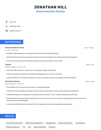 The most important skills for an americanization teacher resume and required skills for an americanization teacher to have include: