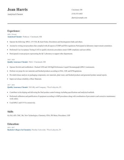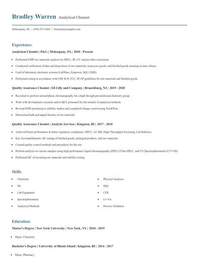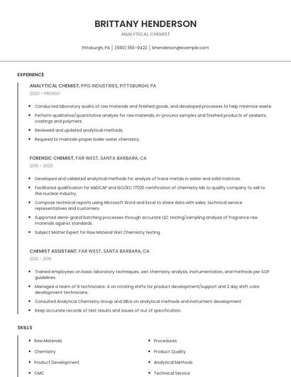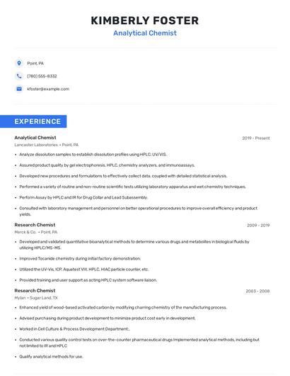 You can use Zippia's AI resume builder to make the resume writing process easier while also making sure that you include key information that hiring managers expect to see on an analytical chemist resume. You'll find resume tips and examples of skills, responsibilities, and summaries, all provided by Zippi, your career sidekick.